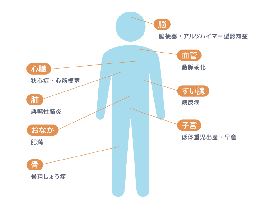 歯周病が重症化すると、歯周病菌が血管内に入り込み血流にのってさまざまな臓器に到達し、次のような全身疾患に影響を及ぼすことがわかっています。